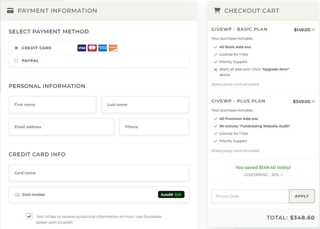 Additional tip: You should add the GiveWP product(s) and service(s) that you want on your cart and leave for few days. They might send you exclusive discount to callout you finish purchase.