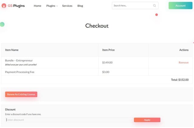 - Add GS Plugins product(s) and service(s) to your cart then move to checkout page.