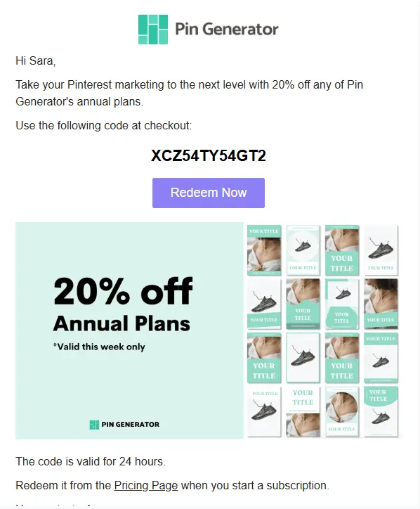 Use this Pin Generator promo code at the checkout to get 20% off. Code applies on all plans. Act now!